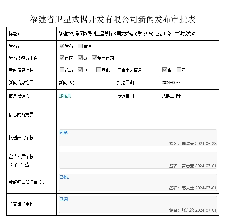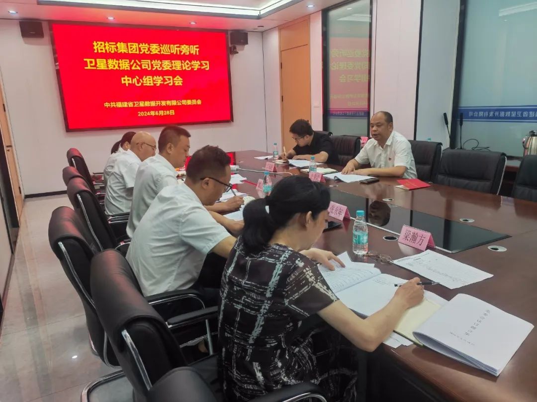 6月28日,福建省招标采购集团权属福建省卫星数据开发有限公司党委召开理论学习中心组学习会,集团党委委员、副总经理张亲议到会巡听旁听,并讲授党纪学习教育专题党课。