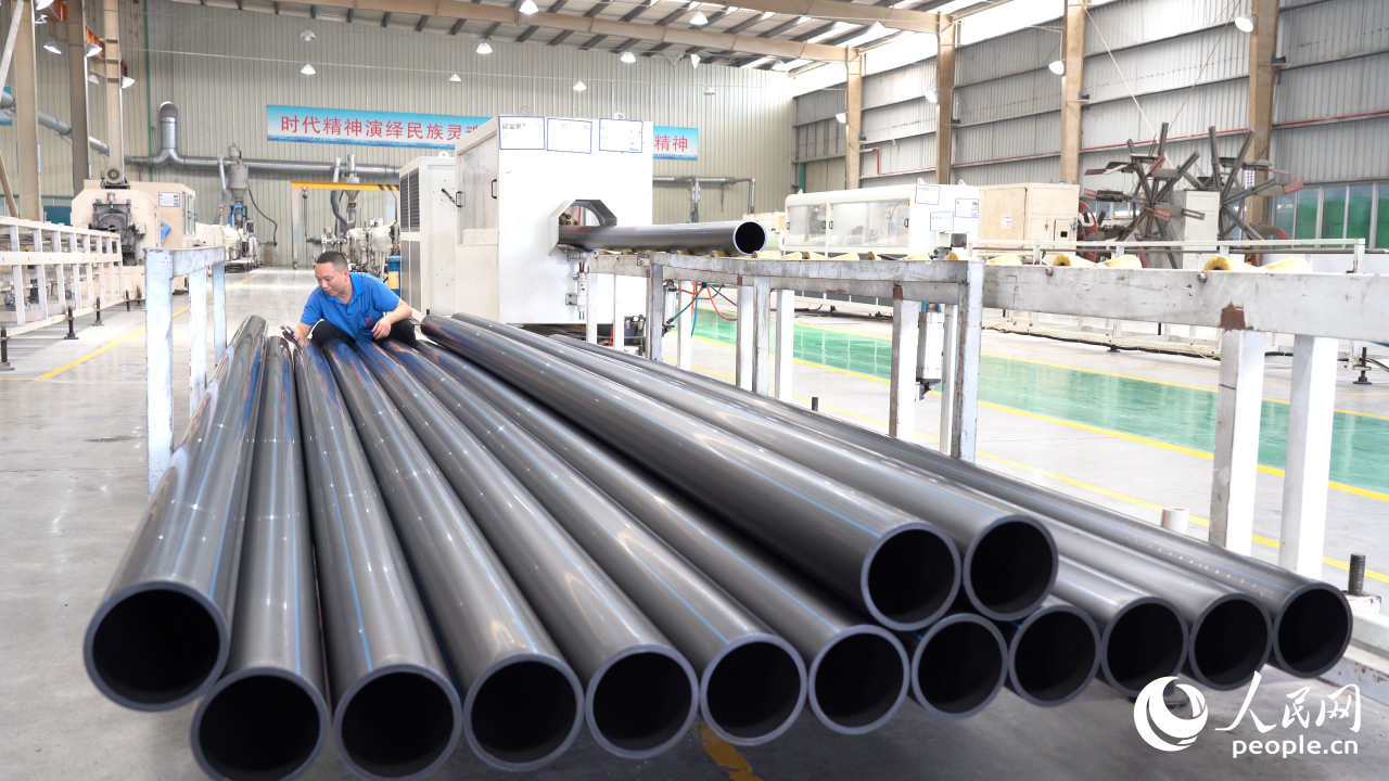 “嗡——嗡——嗡——”管材生产工厂里,自动化流水线正将成袋的原料熔化、塑型、切割成为大小统一的塑料管道,宽敞的厂区里只有数名工人在机器旁忙碌。