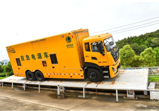 ▲应急电源车在侧翻试验台上进行测试。畅丰专汽供图