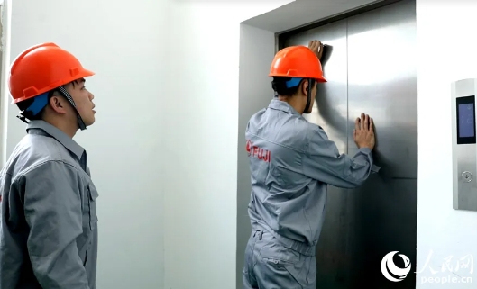 ▲中侨富士的工作人员在检修电梯。人民网记者 兰志飞摄