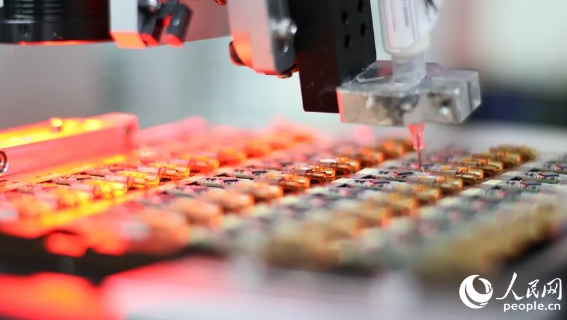 ▲恒宝通生产车间里的自动点白胶工序。人民网 李昌乾摄