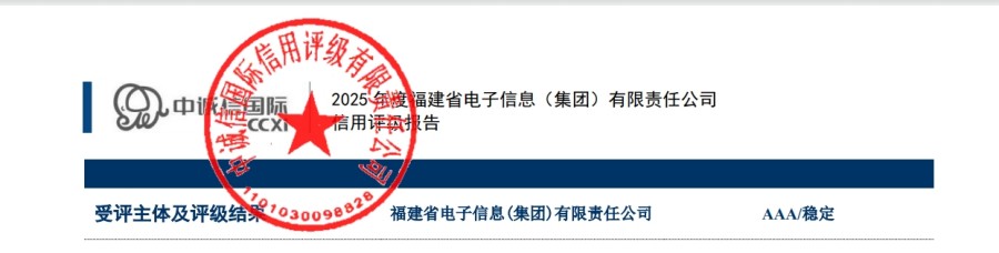 近日,中诚信国际信用评级有限公司对福建省电子信息集团开展了主体信用评级工作,在充分调研、访谈以及沟通等程序的基础上出具评级报告,授予集团主体信用等级AAA级,评级展望为稳定。AAA级为信用评级的最高级别,集团再次获得该级别,是对集团在福建省战略地位的重要性及未来发展给予了肯定,同时,为集团降低融资成本、拓展融资渠道起到积极作用。