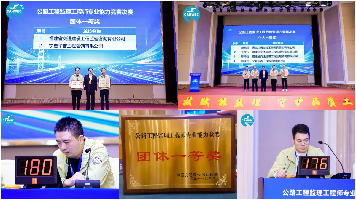 11月8日,由中国交通建设监理协会主办的“第二届公路工程监理工程师专业能力竞赛决赛”在河北石家庄举办,300名参赛选手经初赛考核,共有来自全国27个省份、近百家监理单位的百名选手突围,来到现场参加决赛。福建省招标采购集团权属福建省交通建设工程监理咨询有限公司福州片区王文行和三明片区陈泽铭两位工程师凭借精湛的专业技能和良好的敬业精神获公路工程监理工程师专业能力竞赛个人一等奖、并以团体16分的总得分为闽交监理公司斩获团体一等奖。