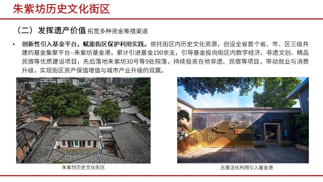 朱紫坊历史文化街区则在资金筹措模式上大胆创新,为街区保护利用注入持久动力。依托丰富的历史文化资源,街区搭建全省首个省、市、区三级共建的基金集聚平台——朱紫坊基金港。截至目前,已累计引进基金190余支,精准引导资本投向数字经济、非遗文创、精品民宿等优质项目,成功落地朱紫坊30号等9处院落活化工程。通过资本赋能在地非遗传承与业态升级,不仅带动了就业与消费增长,更实现了街区资产保值增值与城市产业升级的双赢局面。
